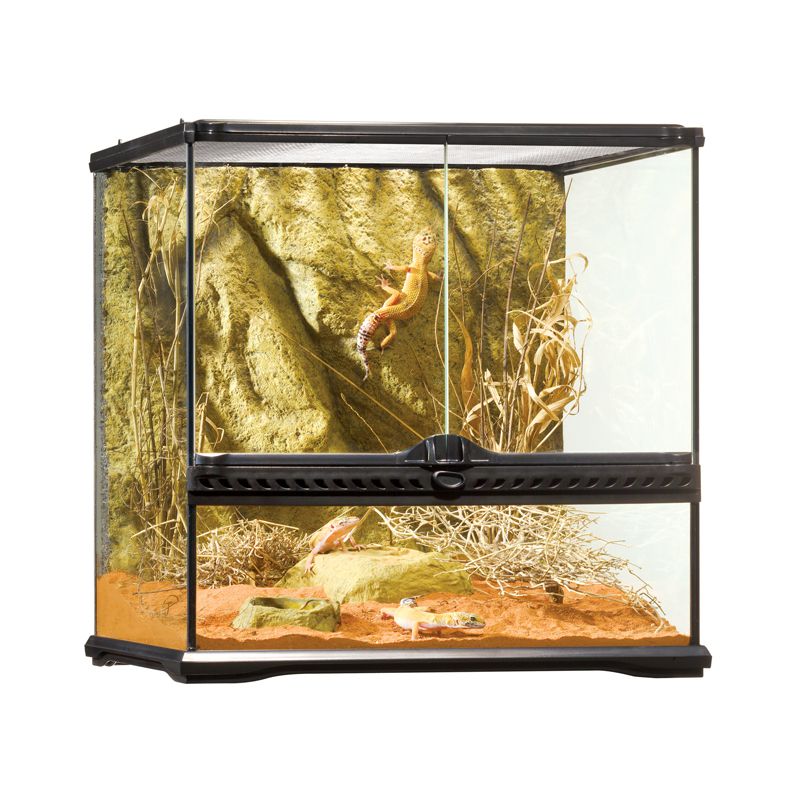 The Exo Terra Glass Terrarium is the ideal reptile or amphibian housing designed by European herpetologists. The front opening doors allow easy access for maintenance and feeding. A specially designed lock will prevent escape and the doors can be opened separately. The full screen top ventilation allows UVB and infrared penetration, and is completely removable for easy access while decorating or cleaning. In the back of the screen cover are 5 closable wire or tube inlets on both sides to install Heat Wave Rocks, Waterfalls, sensors, etc. inside the terrarium. The bottom plate of the terrarium is raised to mount a substrate heater to heat a part of the extended ground surface. The extra high fixed front window is ideal for thick layers of substrates (burrowing reptiles), aquatic parts (paludarium) or to mount an Exo Terra Reptile Den. The natural background has the same color as many other Exo Terra decoration items (Water Dishes, Waterfalls, Heat Wave Rocks, etc.) and provides an extra climbing dimension.